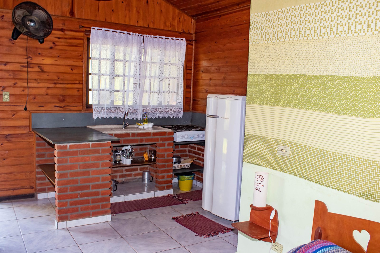 Todos os chalés possuem banheiro com chuveiro a gás, cama de casal e bi cama, ou, cama de casal e beliche, tv, espaço gourmet com geladeira, fogão e utensílios, na sua varandinha uma charmosa churrasqueira.